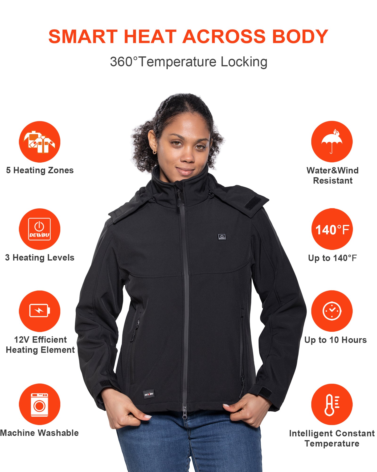DEWBU heated coats are built with high-quality and professional water-resistant softshell materials and a waterproof zipper. They also have good tensile strength, scratch resistance, and wind resistance. Heating elements and overall jacket structure are designed to endure routine hand or machine wash.