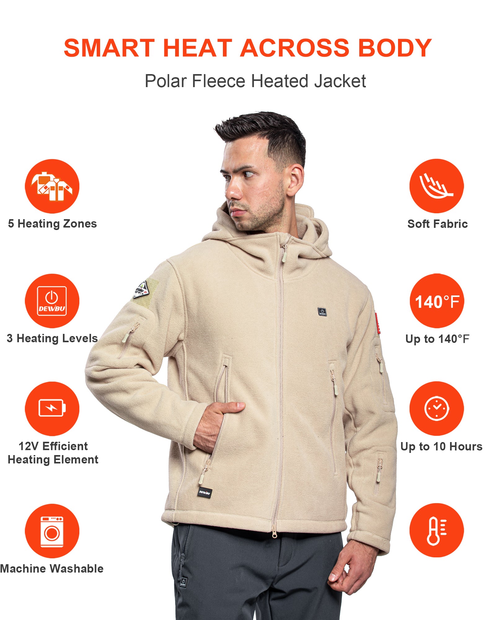 The Polar Fleece Heated Jackets are equipped with 5 heating zones and 3 heating modes. Upgraded 12V heating element and battery pack can heat jackets up to 140℉ in just seconds. Using the DEWBU 12V special cable to connect car cigarette lighter or other portable power sources in order to get a longer run time for the jacket. Enjoy its softness and comfort while feeling a perfect warmth.