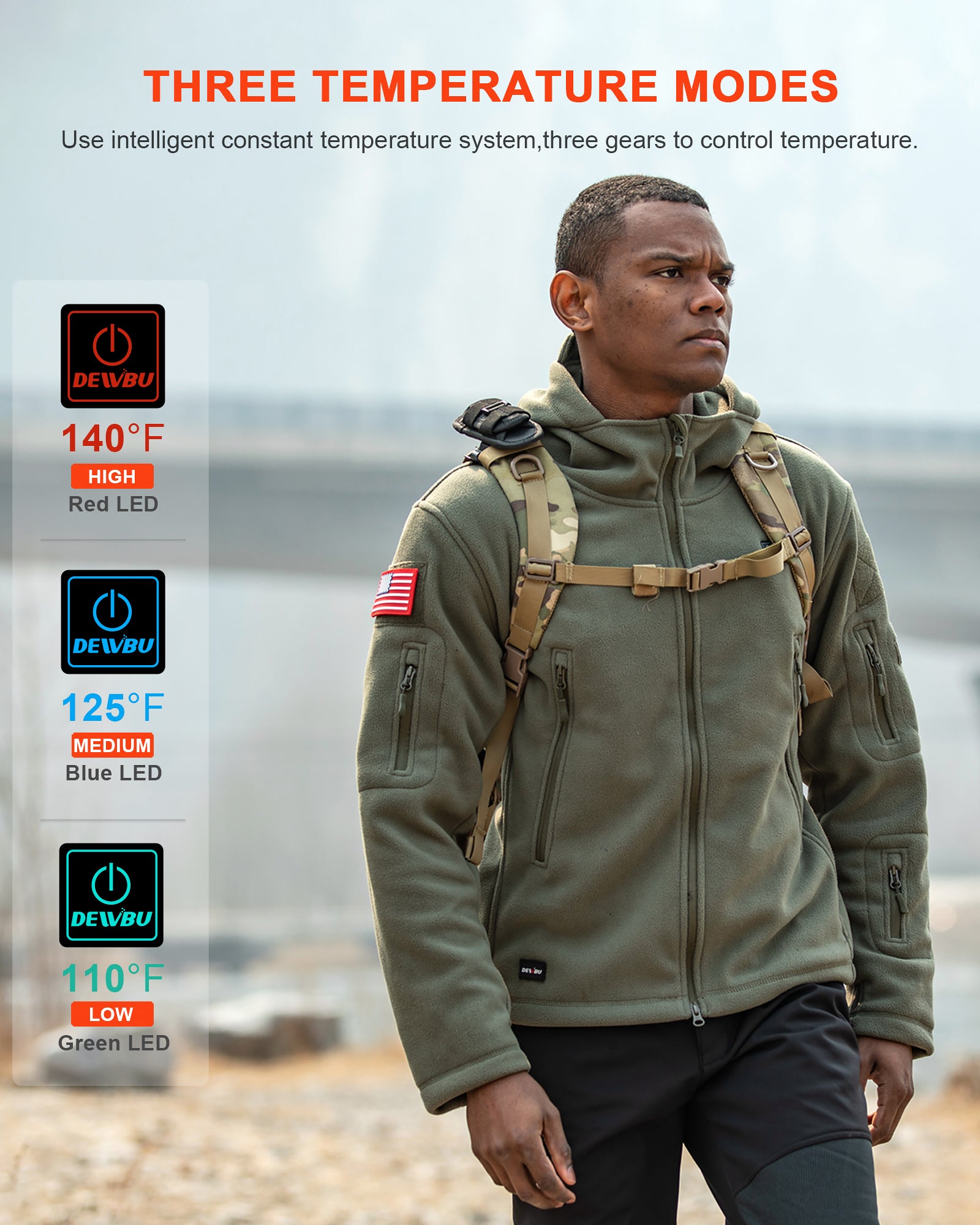 The Polar Fleece Heated Jackets are equipped with 5 heating zones and 3 heating modes. Upgraded 12V heating element and battery pack can heat jackets up to 140℉ in just seconds. Using the DEWBU 12V special cable to connect car cigarette lighter or other portable power sources in order to get a longer run time for the jacket. Enjoy its softness and comfort while feeling a perfect warmth.