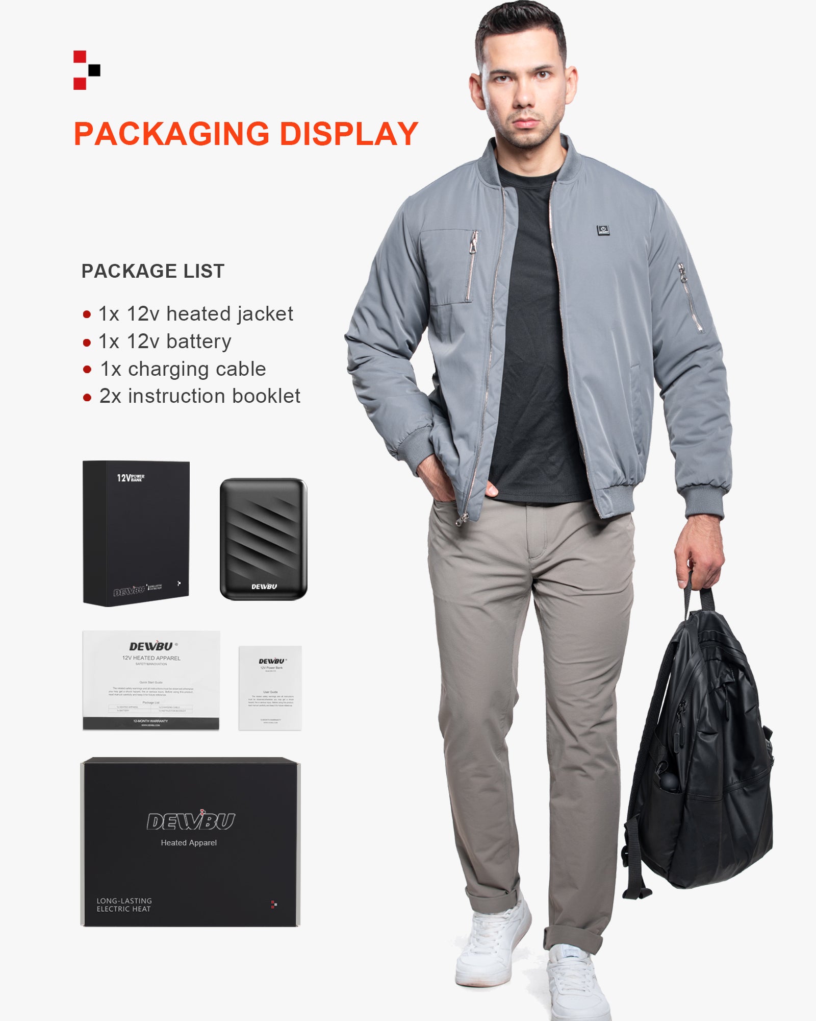 DEWBU heated jacket uses a 12V power system, which can be connected to the portable power station, motorbike, boat, ATV, snowmobile, or any other vehicle through a DEWBU 12V connector wire (Connector Wire Sold by DEWBU Separately) to keep you warm in extremely cold winter without time limited.