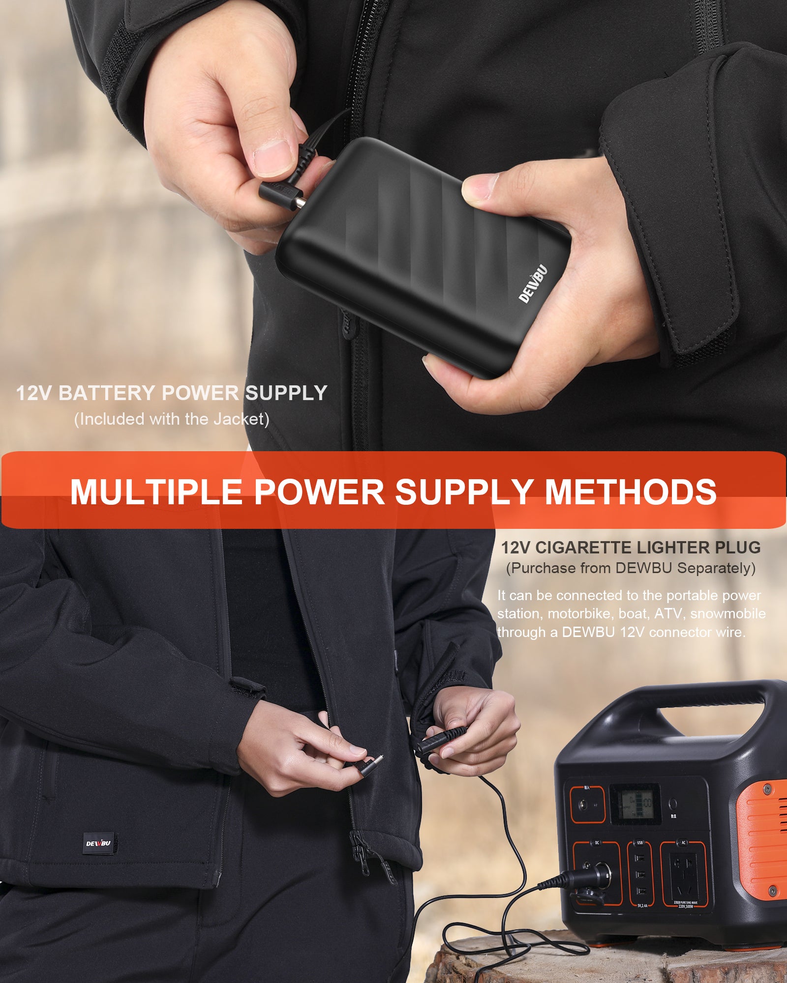 DEWBU heated jacket uses a 12V power system, which can be connected to the portable power station, motorbike, boat, ATV, snowmobile, or any other vehicle through a DEWBU 12V connector wire (Connector Wire Sold by DEWBU Separately) to keep you warm in extremely cold winter without time limited.
