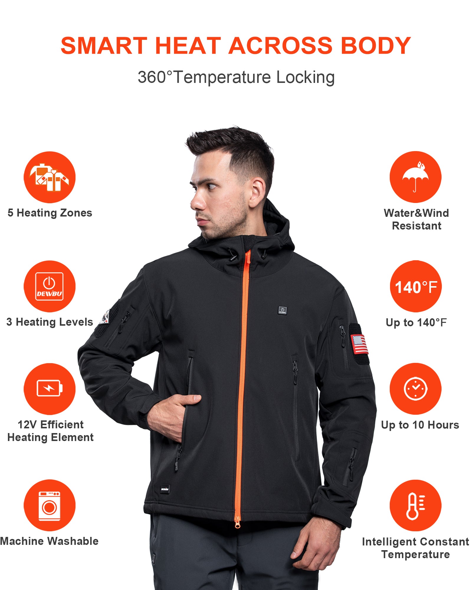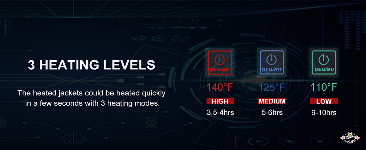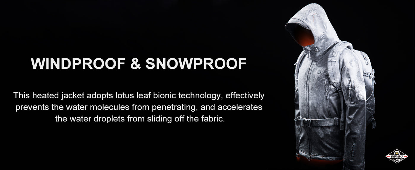 DEWBU heated coats are built with high-quality and professional water resistant soft shell materials with excellent breathability. They also have good tensile strength, scratch resistance and wind resistance. Heating elements and overall jacket structure are designed to endure routine hand or machine wash.