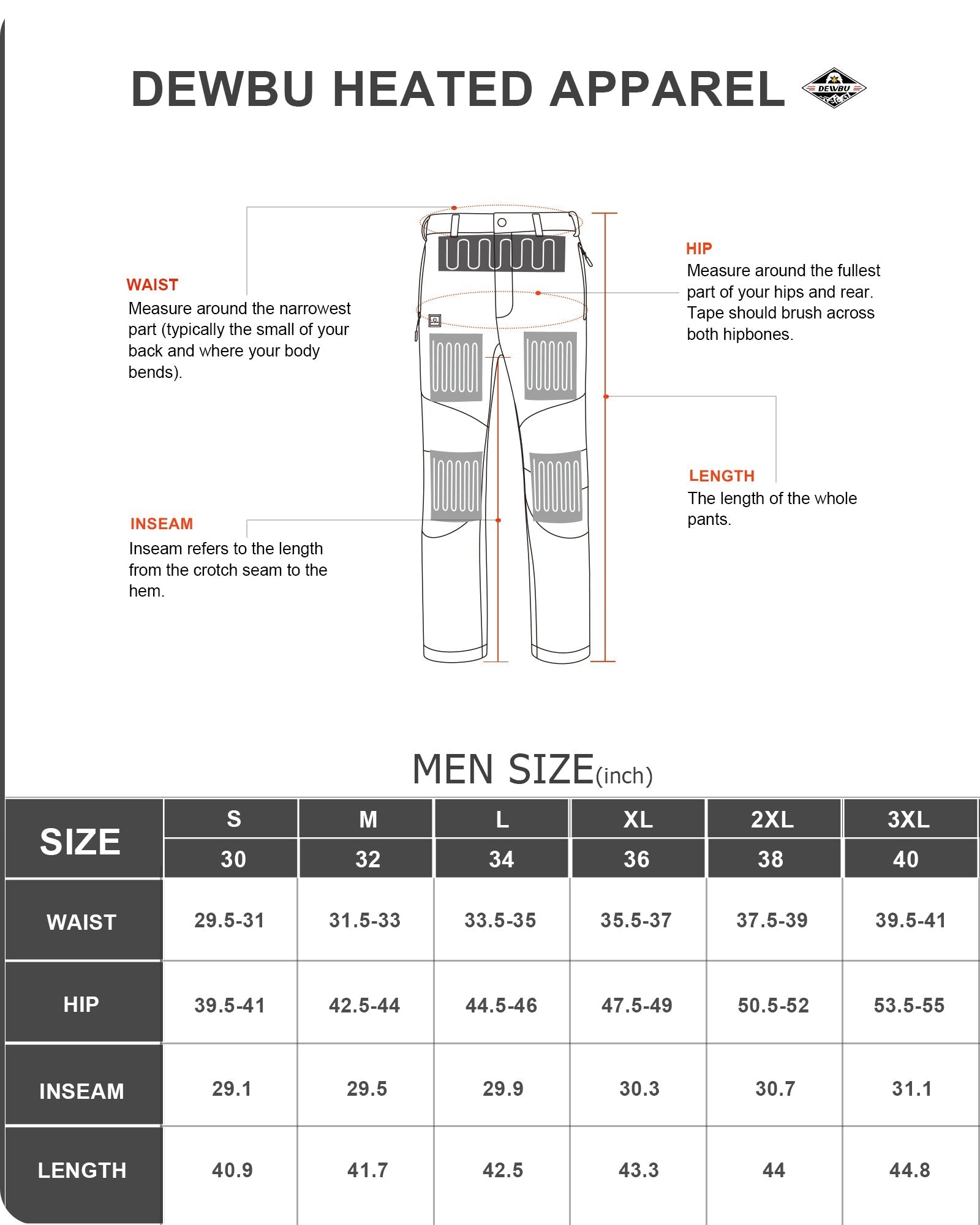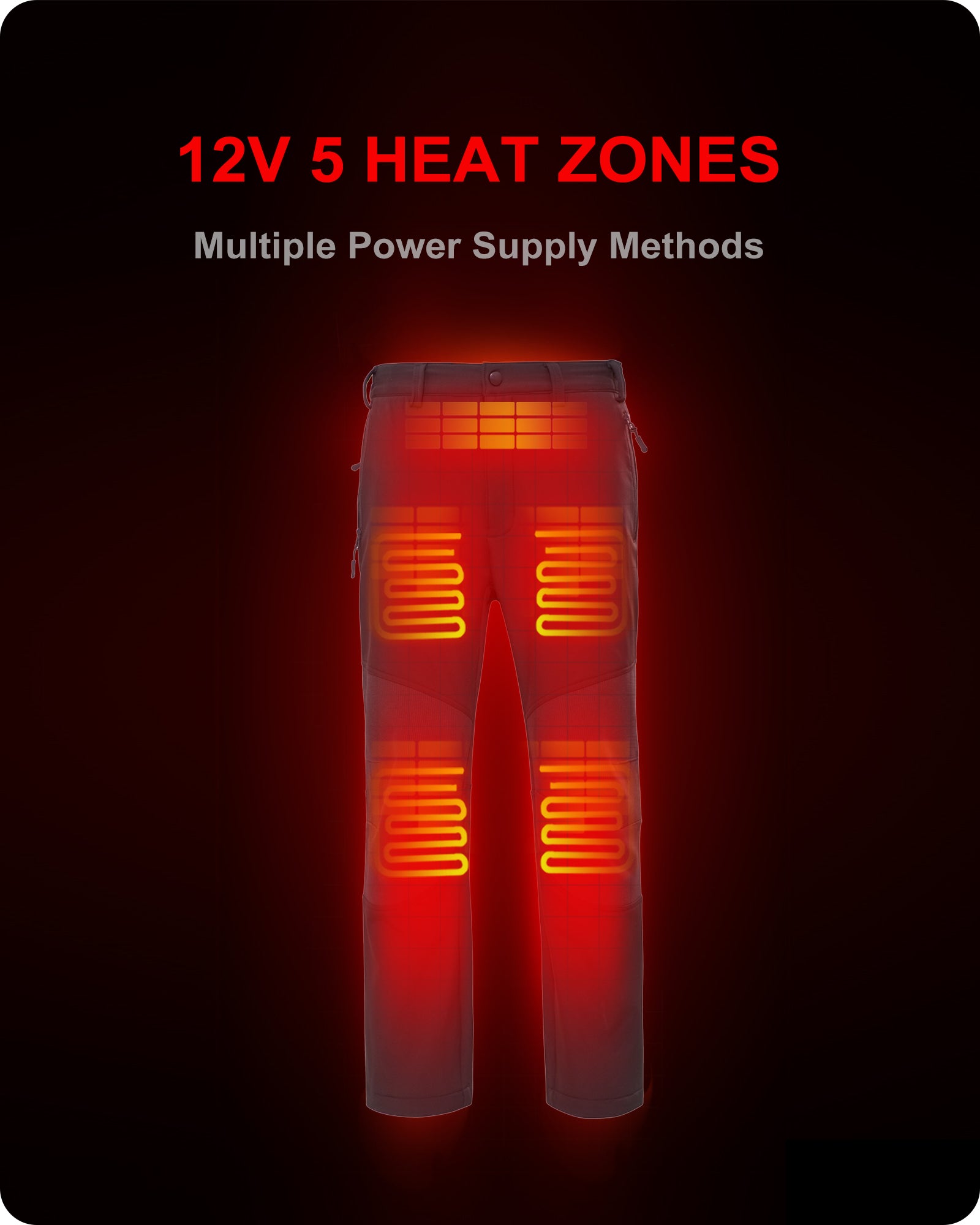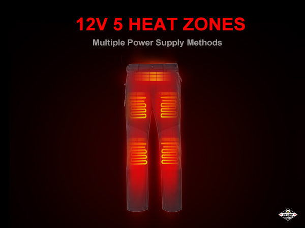 OUTER MATERIAL: Polyester, Spande INNER MATERIAL: Polyester HEATING ZONES: 5 heat zones. (Two in the thighs, Two in the knees, and one in the waist) POCKETS: Multiple zipped pockets Design, Convenient Storage. BATTERY: Battery Energy 54Wh (equivalent to an ordinary 15000mAh mobile power bank, the output power is up to 12V). HEATING MODE(TEMPERATURE): Low: 110° F, Med: 125° F, High: 140° F HEAT-UP TIME(FULLY CHARGED) : Low: 9-10hrs, Med: 5-6hrs, High: 3.5-4hrs 12V MULTIFUNCTIONAL SUPPLY CABLE: 12V heated element can use car cigarette lighter and portable-power.(cable need to be purchased separately). CARE INSTRUCTIONS: Hand/Machine Wash WARRANTY: 1-Year Limited Warranty on Heated Apparel