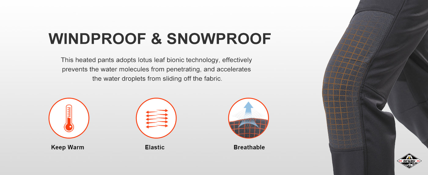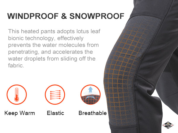 The heated pants are built with high-quality and breathable water-resistant soft shell materials. The inner material uses soft fleece to increase warmth. The whole pants have excellent tensile strength, scratch resistance, and wind resistance. The heating elements and overall construction are designed to endure routine hand or machine washing.