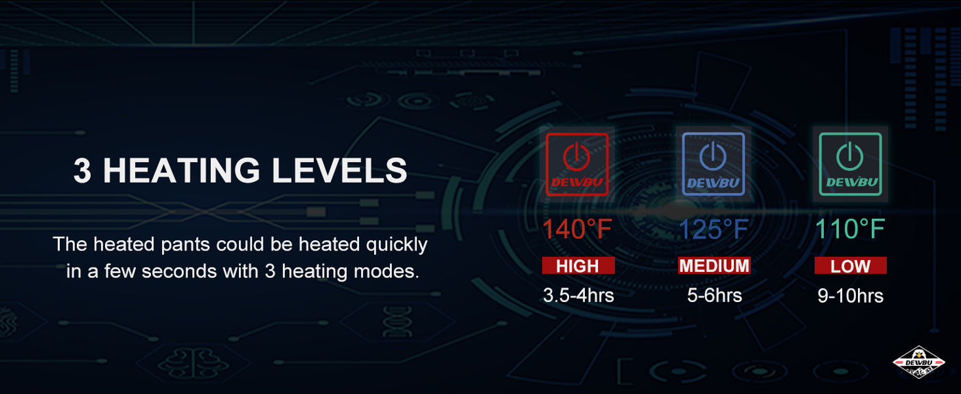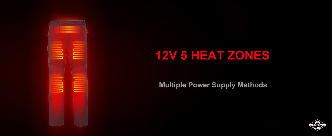 DEWBU outdoor heated pants uses a 12V power system, which can be connected to the portable power station, motorbike, boat, ATV, snowmobile, or any other vehicle through a DEWBU 12V connector wire (Connector Wire Sold by DEWBU Separately) to keep you warm in extremely cold winter without time limited.