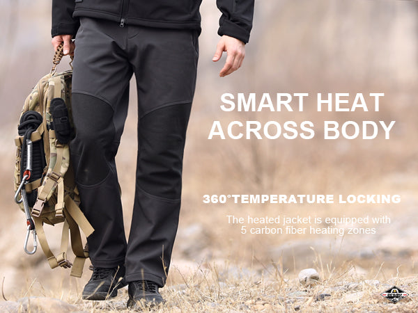 The heated pants for men are designed with 5 carbon fiber heating zones (two on the thighs, one on the waist, and two on knees). It can heat your entire core area of the heated pants to keep you warm, two thigh heating zones in the pockets can also keep your hands warm at the same time. You can adjust 3 heating modes by short-pressing the power button (Red, Blue, and Green).