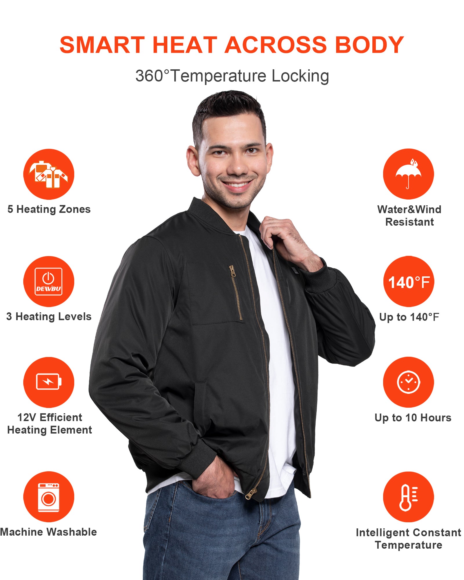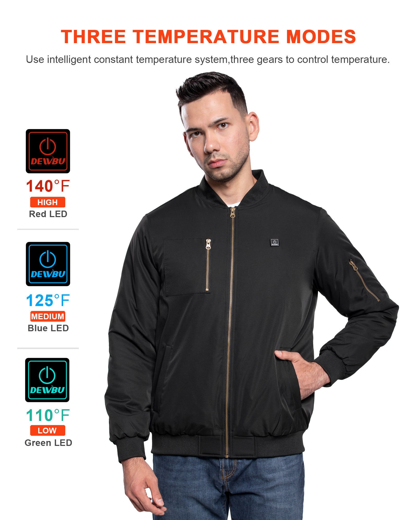 Men's Heated Bomber Padded Jacket with 12V Battery Pack -Black With Copper Zipper