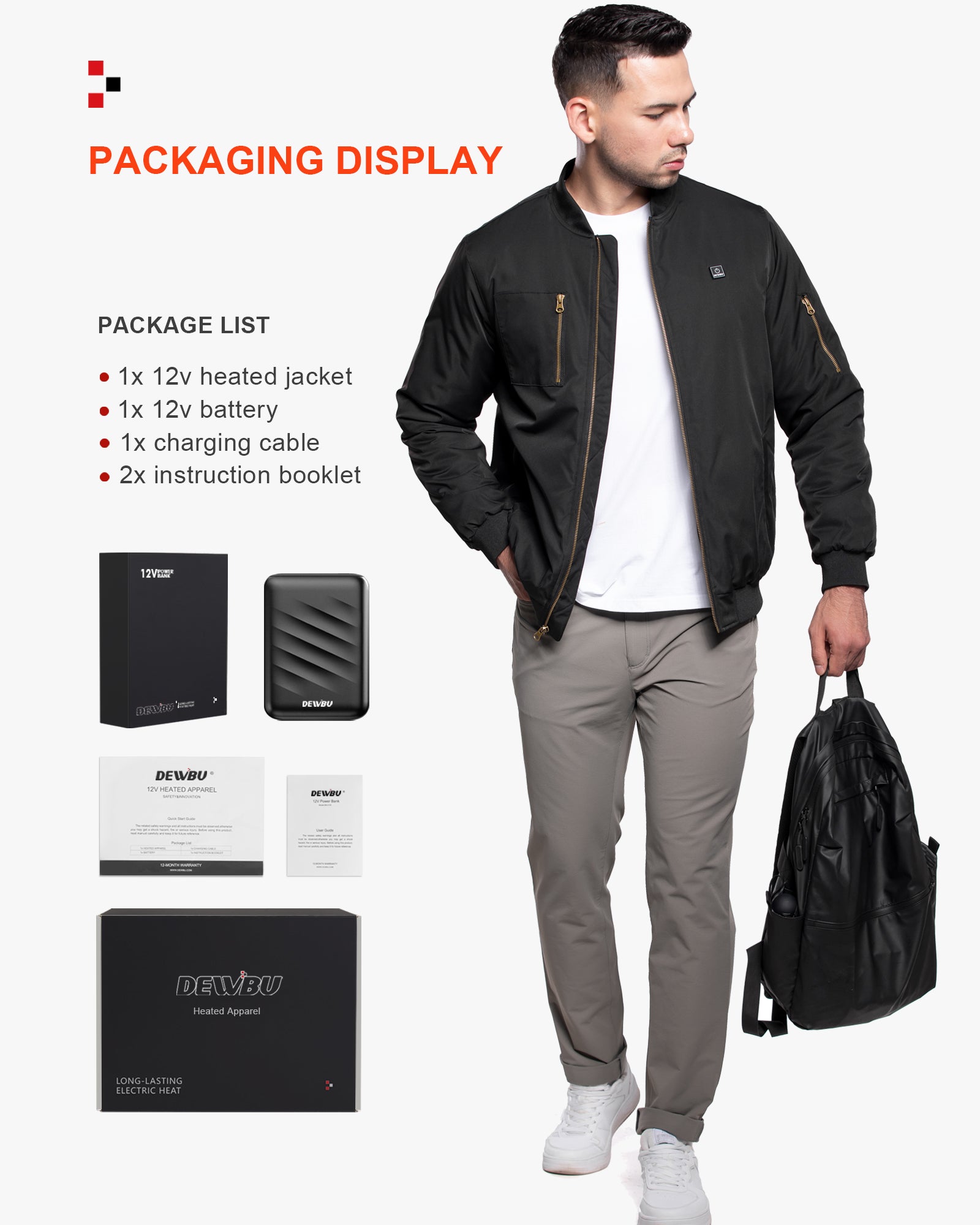 Heated jacket in bomber styling, with padding of premium cotton, lightweight, and comfortable. Includes 2 slant hand pockets, 1 zippered chest pocket, and 1 zippered pocket on left arm for keeping some little stuff such as cash, coins, credit cards, keys, and so on. It’s a must-have fashion item for winter, especially a stand collar that keeps you toasty without sacrificing street style, which is suitable for daily or outdoor activities.