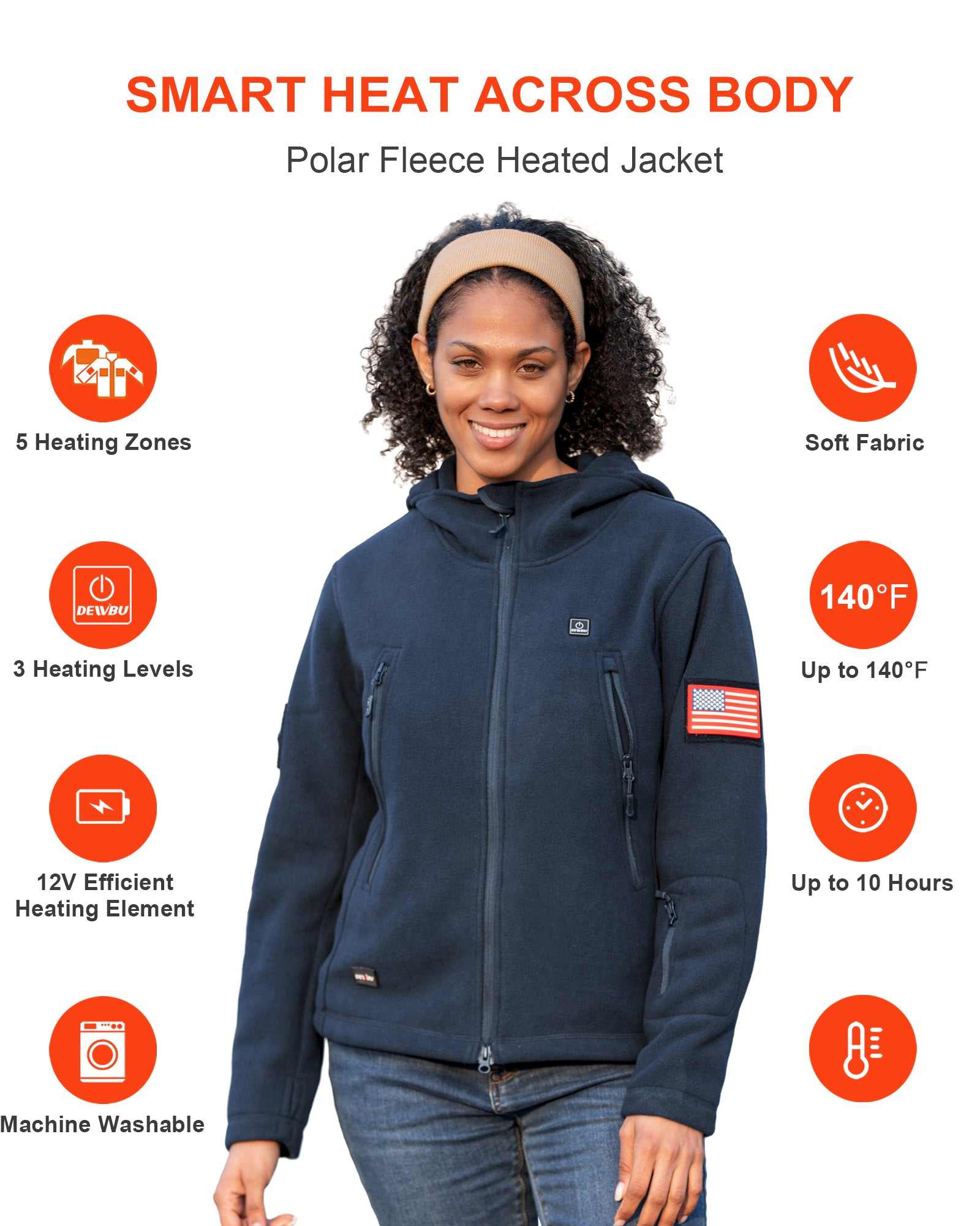 OUTER MATERIAL: 100% Polyester INNER MATERIAL: 100% Polyester HEATING ZONES: 5 heat zones. Two in the left & right belly, Two in the arms, and a large zone in the back. POCKETS: Multiple zipped pockets Design, Convenient Storage. HEAD HOOD: The Detachable Hood, Offers You a Great Flexibility BATTERY: Battery Energy 54Wh (equivalent to an ordinary 15000mAh mobile power bank, the output power is up to 12V). HEATING MODE(TEMPERATURE): Low: 110° F, Med: 125° F, High: 140° F HEAT-UP TIME(FULLY CHARGED) : Low: 9-10hrs, Med: 5-6hrs, High: 3.5-4hrs 12V MULTIFUNCTIONAL SUPPLY CABLE: 12V heated element can use car cigarette lighter and portable-power.(cable need to be purchased separately). CARE INSTRUCTIONS: Hand/Machine Wash WARRANTY: 1-Year Limited Warranty on Heated Apparel