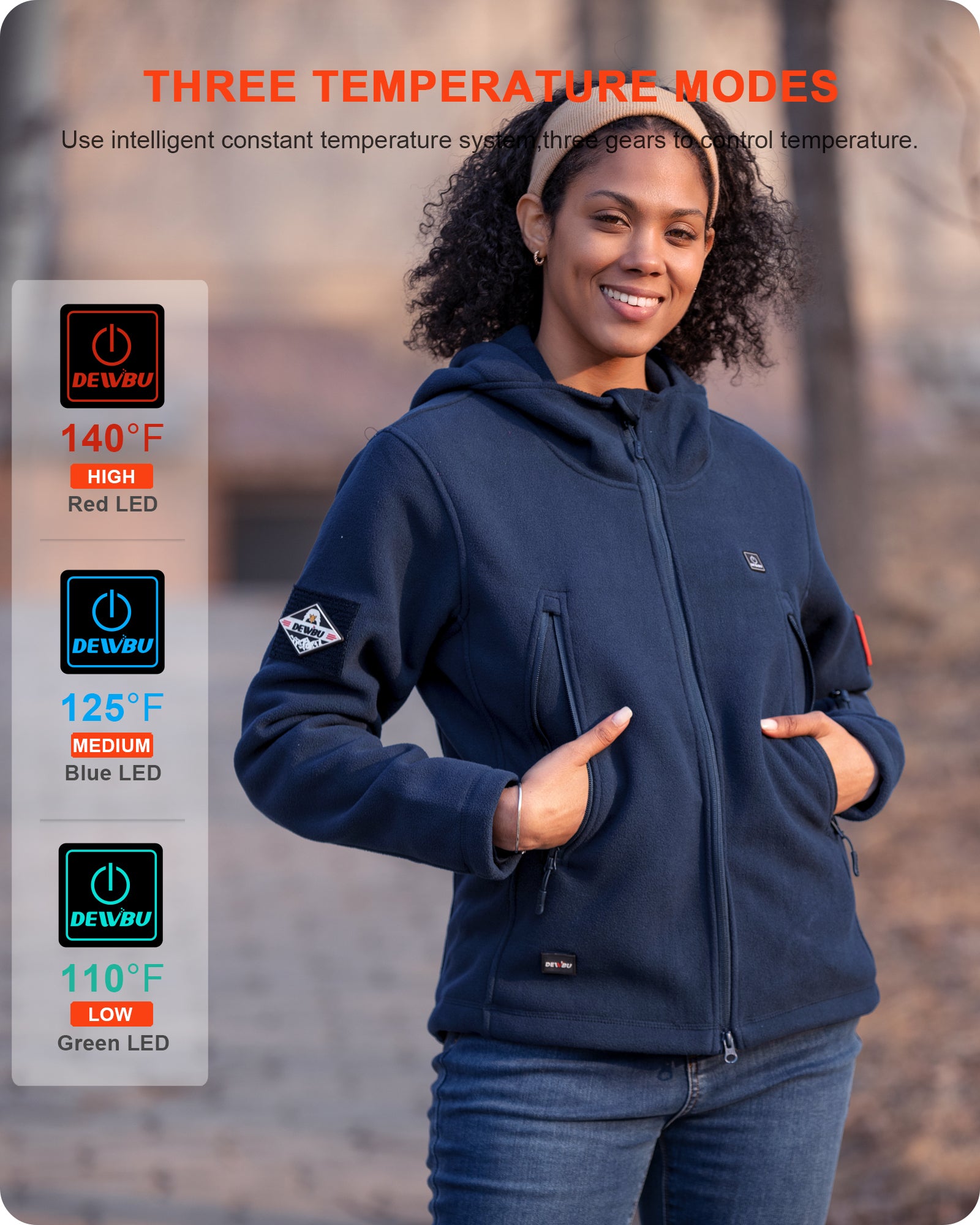 The Heated jackets for women are equipped with 5 carbon fiber heating zones (two on front, one on back, and one on each arm). It can heat up your entire core body area and keeps you warm, there are two heating zones near the front pockets that can keep your hands warm at the same time. You can adjust 3 heating modes by short-pressing the power button (Red, Blue, and Green).