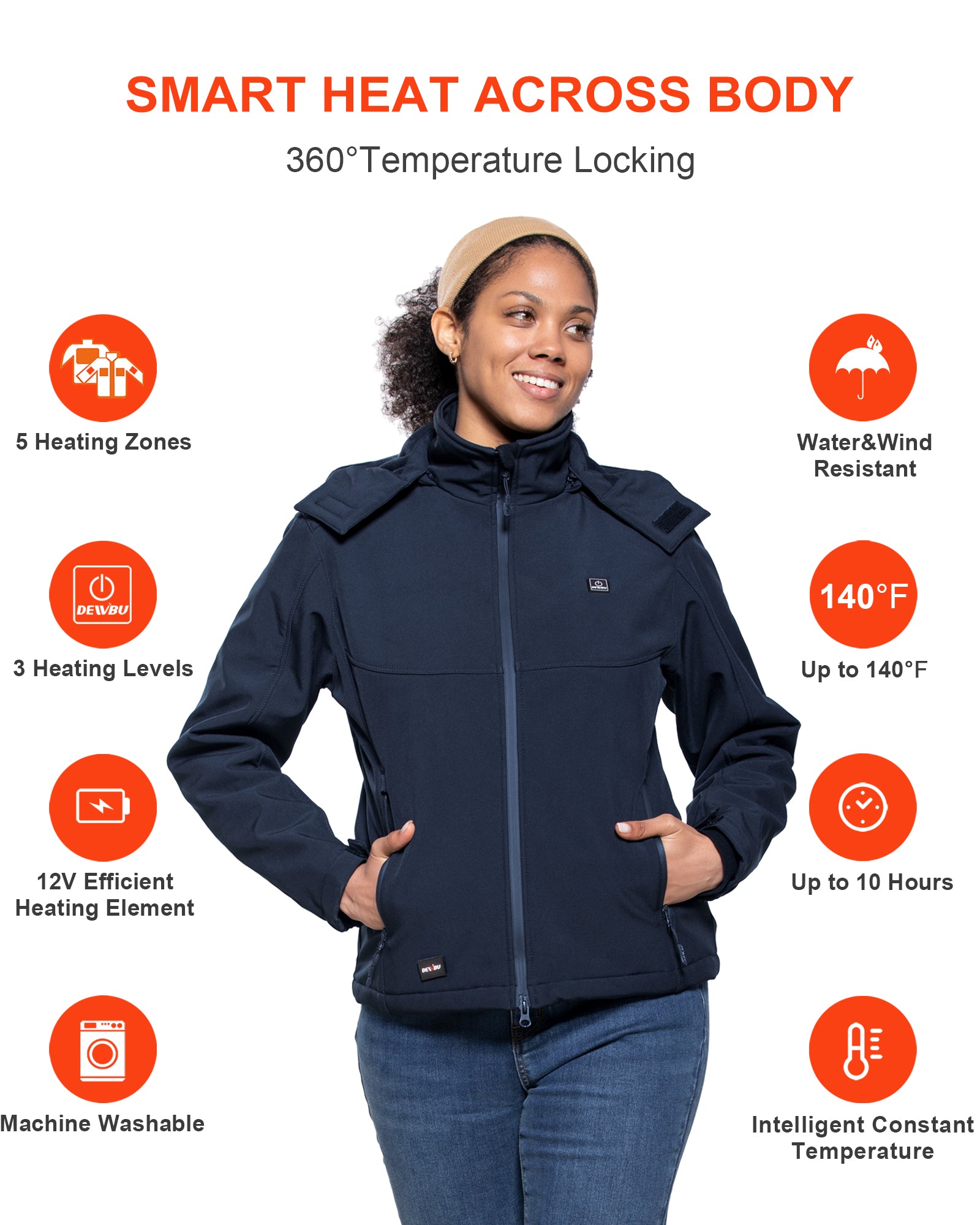 Women's Heated Jacket Detachable Hood With 12V Battery Pack - Dark Blue